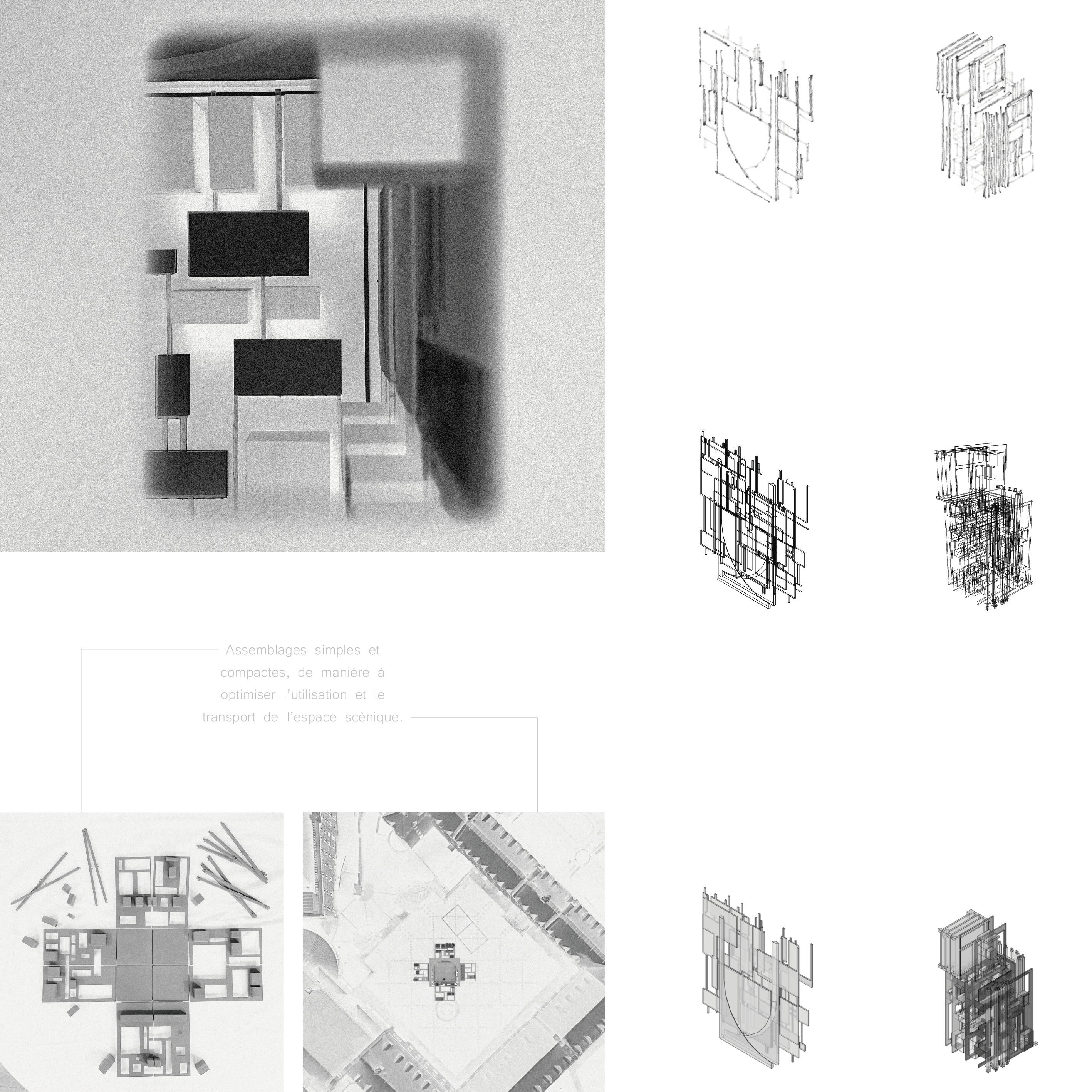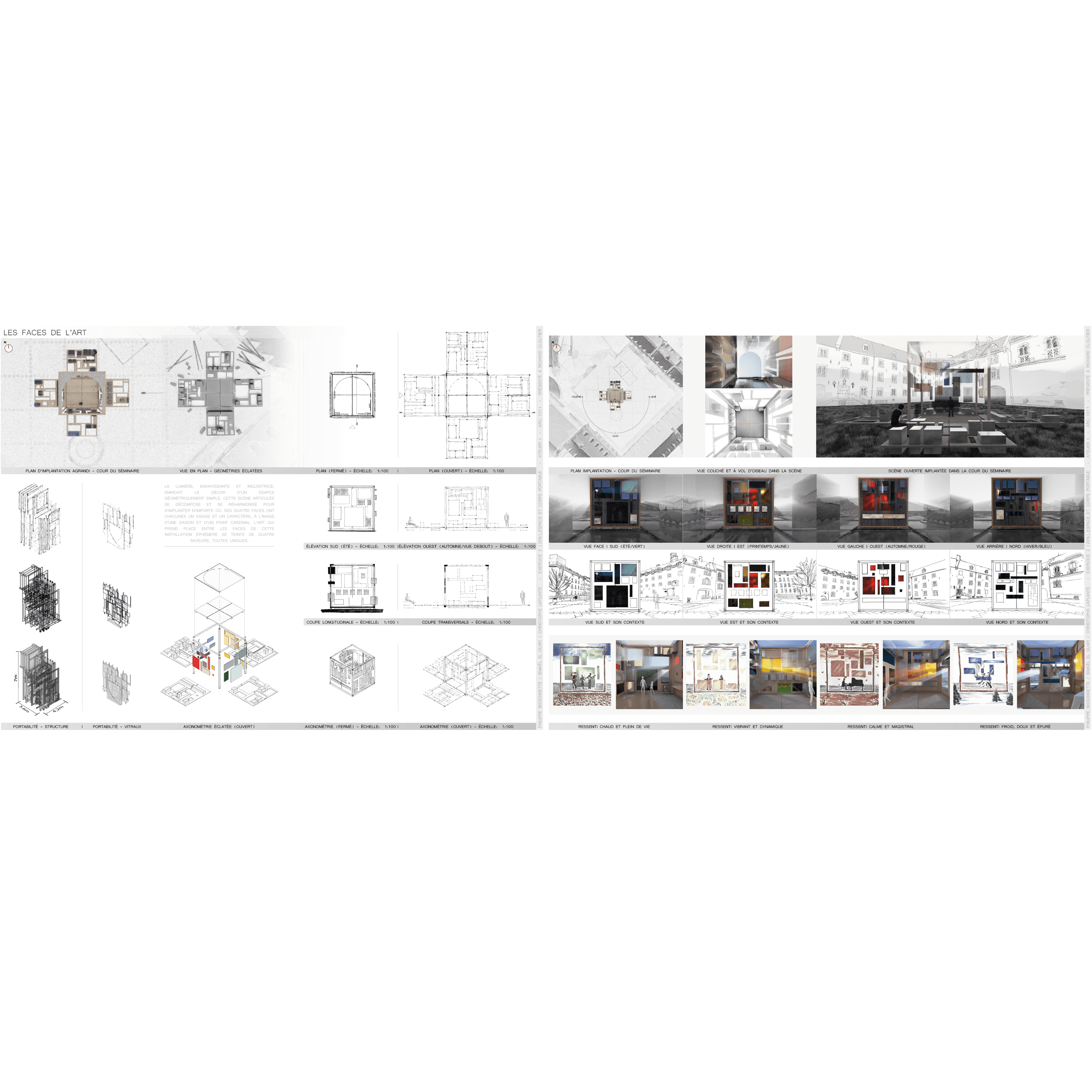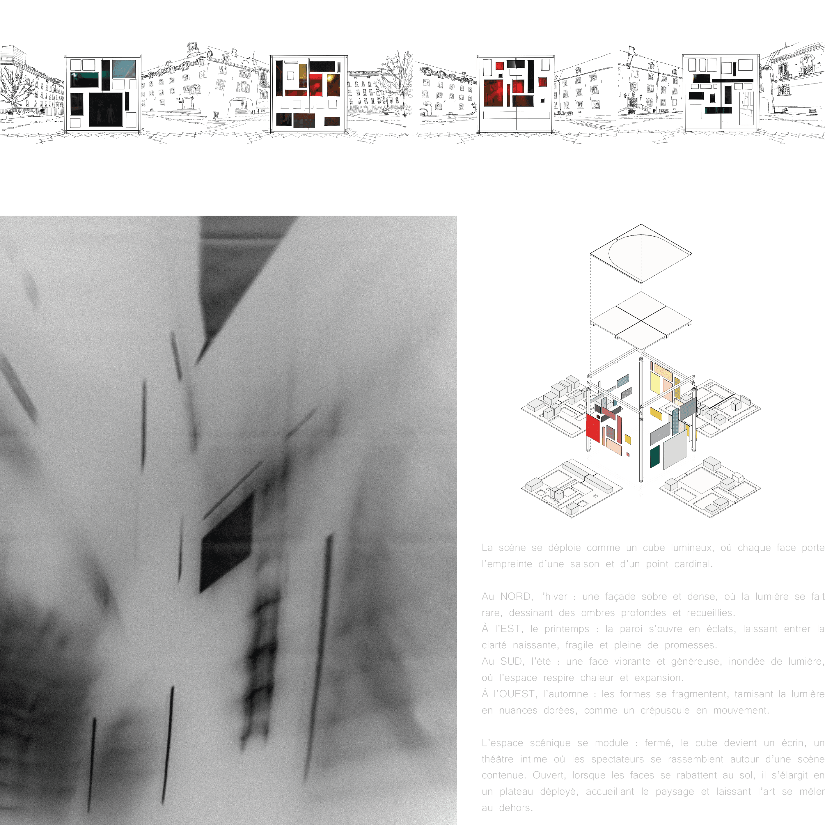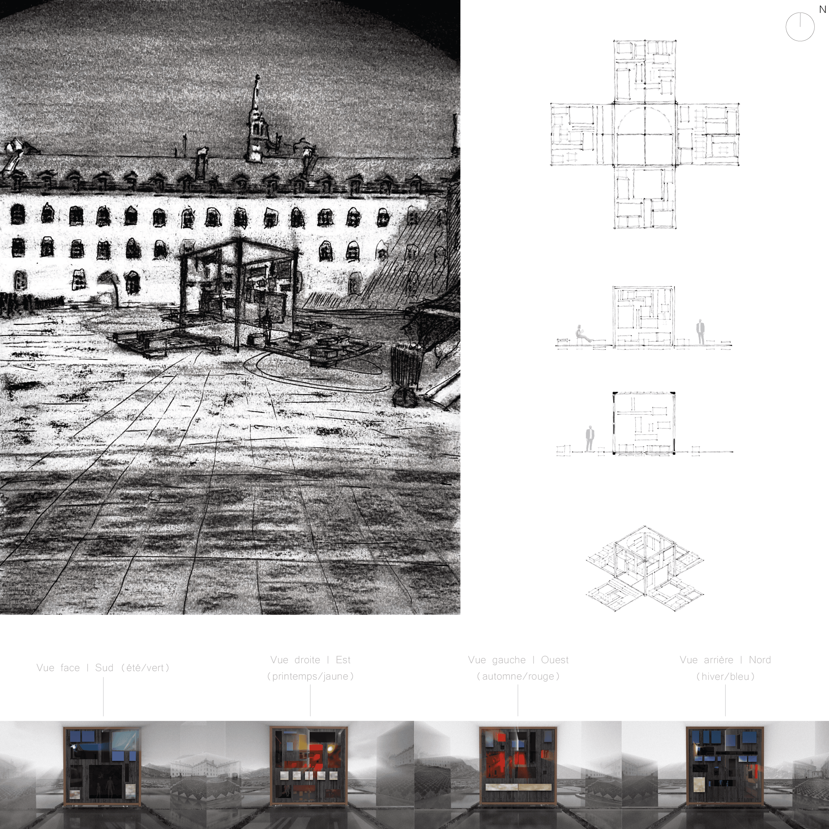 La scène adaptative | Dans la cour du Séminaire du Vieux-Québec, la scène s’élève avec simplicité face à la monumentalité des façades. Le fusain, dans sa profondeur et ses nuances, fait vibrer la force du geste et la fragilité du temps. Autour d’elle, bancs et passages suggèrent l’accueil et la rencontre, tandis que ses parois mobiles promettent un espace toujours changeant. Cette présence géométrique respire avec son contexte : un cœur vivant au sein d’un patrimoine figé, oscillant entre recueillement et ouverture. Plan, élévation, coupe et axonométrie en révèlent la clarté silencieuse. En contrebas, les rendus des quatre faces esquissent le cycle des saisons, et la scène, capable de se transformer, respire avec le temps et s’adapte au contexte, entre recueillement et ouverture.